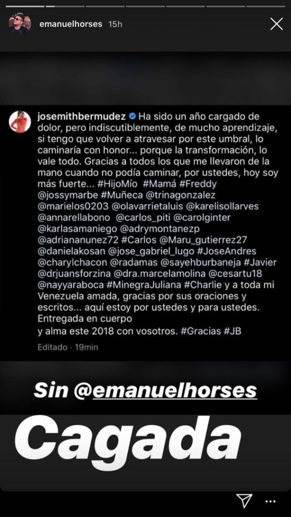 Y sin temor a nada, Emanuel Andrade, hijo del «Tuerto» Andrade, usó sus redes sociales para contrarrestar las acciones de la animadora venezolana, Josemith Bermúdez, quien ahora quiere hacer creer que entre ellos no existe ningún lazo.