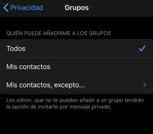 Con esto, Whatsapp garantiza que solo las personas que elijas podrán agregarte a grupos o en caso de que no quieras que nadie te agregue, tendrán que contactarte por el chat individual para que los autorices primero.