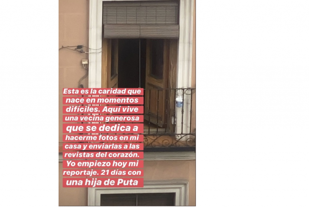 Jaime mostró el balcón de su vecina, que tenía las puertas abiertas y la persiana arriba; además, aprovechó para dejarle un mensaje con el que le hizo saber que ya estaba al tanto de todo.“Esta es la caridad que nace en momentos difíciles. Aquí vive una vecina generosa que se dedica a hacerme fotos en mi casa y a enviarlas a las revistas del corazón. Yo empiezo hoy mi reportaje. 21 días con una hija de puta”, expresó.