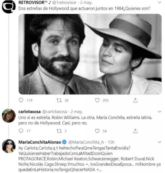 Ante esto, Carlota Sosa decidió dar su opinión comentando lo siguiente: “Uno sí es estrella, Robin Williams. La otra, María Conchita, estrella latina, pero no de Hollywood. Casi, pero no“.