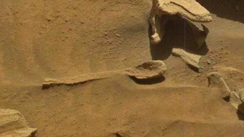 Para muchos creyentes de los extraterrestres, esta imagen capturada por el Rover de la NASA era una clara evidencia de vida inteligente en el planeta rojo, pues claramente se trataba de un utensilio para comer gigante, y la teoría tomó fuerza pues no es la primera vez que la NASA reveló un artefacto similar. Sin embargo, no hay explicación y muchos creen que se trata sólo de una ilusión optica.