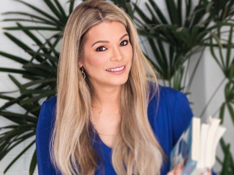En la fotografía la exreina de belleza luce una franela color azul, con un maquillaje bastante natural, pero un rojo que resalta sus labios; dejando como protagonista a su larga, abundante y dorada cabellera.