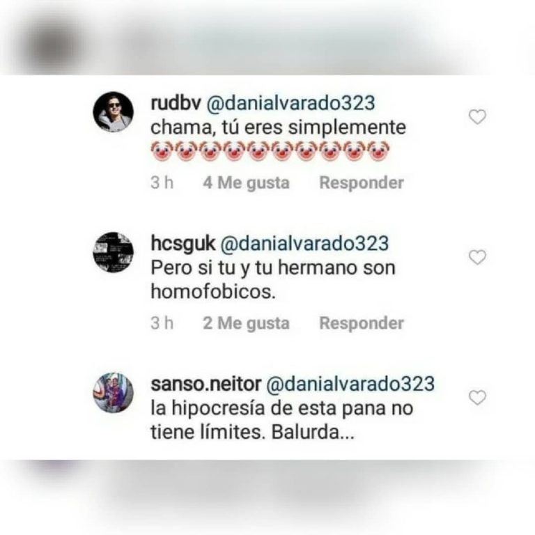 «Pero si tú y tu hermano son homofóbicos», «La hipocresía de esta pana no tiene límintes. Balurda», fueron algunos de los comentarios hechos a Alvarado a través de la casilla de comentarios.