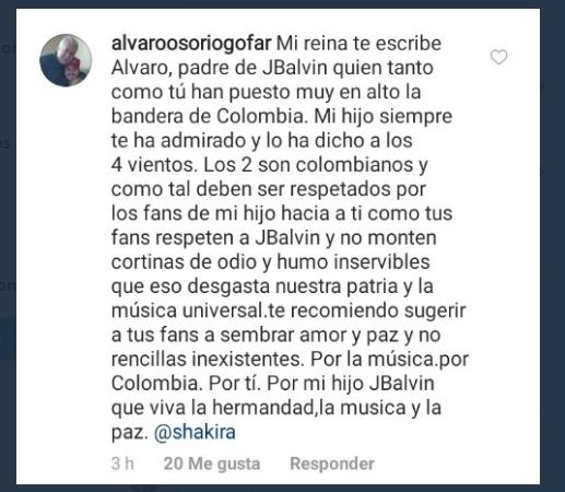 Álvaro Osorio le mandó un mensaje a Shakira para que detenga el odio hacia su hijo: «Los dos son colombianos y como tal deben de ser respetados, por los fans de mi hijo hacia ti, como tus fans respeten a J Balvin y no monten cortinas de odio y humo inservibles, que eso desgasta nuestra patria y la música universal. Te recomiendo sugerir a tus fans a sembrar amor y paz, no rencillas inexistentes”.
