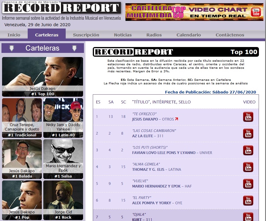 Tras ocho semanas sonando fuertemente en las radioemisoras más importantes del país; Jesús Dakapo consigue el primer lugar en 3 listados de la cartelera radial más importante de Venezuela: Record Report.