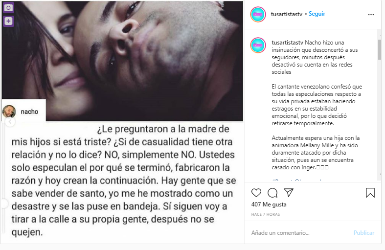 Poco antes de realizar el mencionado post, publicó una imagen en donde soltó todos sus pensamientos en contra del programa Suelta la sopa por algunos improperios que realizaron entorno a su situación personal actual con su esposa Inger Devera y su novia la modelo Melany Mille, quien está embarazada del cantante.