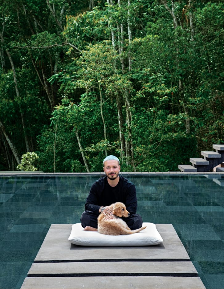 El tranquilo refugio campestre de Balvin está situado en un paisaje selvático y destaca por sus planos de roble francés, su aerodinámico mobiliario de estilo escandinavo y sus florecientes diseños japoneses; incluyendo puertas de lino enmarcadas y plantas de bonsái.