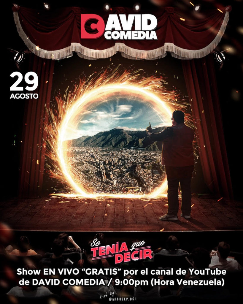 La cita es el sábado 29 de agosto a las 9.00pm, donde David Comedia, pretende llevar alegrías, risas, carcajadas e incluso gritos de emoción a su gente, reuniendo varias manifestaciones humorísticas que van desde imitación de voces a personalidades públicas, rutinas de cómo fue su llegada a USA, la difícil tarea de ser padre y esposo siendo comediante y lograr una interacción con el público a través del chat de la plataforma.