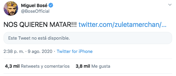 A través de su cuenta de Twitter, Bosé reaccionó a un mensaje que hacía referencia a la relación directamente proporcional entre los vacunados contra la gripe y fallecidos por covid-19. “Nos quieren matar”, escribió el cantante