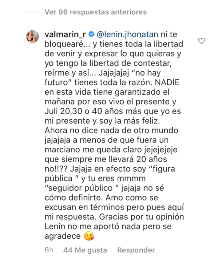 Si bien muchos seguidores apoyan a Julián y Valeria en su historia de amor, no ha faltado quienes han dudado del futuro de su relación, debido a la diferencia de edades, pues ella está cerca de cumplir los 30 y él tiene 50 años.