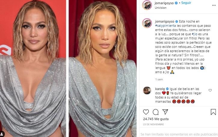 «¡Sé que JLo es una mujer espectacular sin filtro! Pero las redes solo aplauden la perfección que solo existe con retoques. ¿Creen que algún día apreciaremos la belleza de la gente al natural? Sin filtros», comentó junto al collage de las dos imágenes.