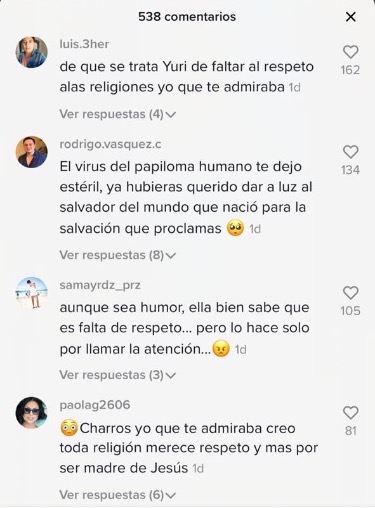 “¿De qué se trata, Yuri, de faltar al respeto a las religiones” “Yo te admiraba”, “hay que respetar la religión de los demás”, “Toda religión merece respeto”, “Bien sabe que es una falta de respeto”, “Si eres cristiana no te gustaría que se burlaran de tus creencias o sí?”, fueron algunos de los comentarios.