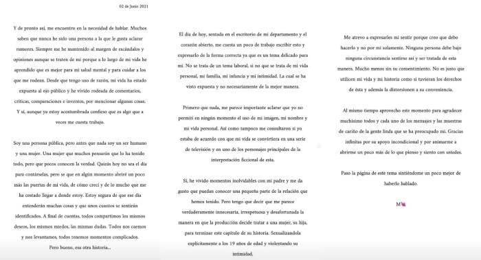 «Me importante aclarar que yo no permití en ningún momento el uso de mi imagen, mi nombre y mi vida personal. Así como tampoco me consultaron si yo estaba de acuerdo con que mi vida se convirtiera en una serie de televisión y en unos de los personajes principales de la interpretación ficcional de esta», detalló Salas.