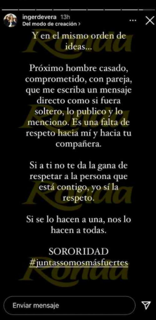 “Próximo hombre casado, comprometido, con pareja que me escriba un mensaje directo como si fuera lo soltero, lo publico y lo menciono. Es una falta de respeto hacia mí y hacia tu compañera”, fue parte de lo que escribió la artista.