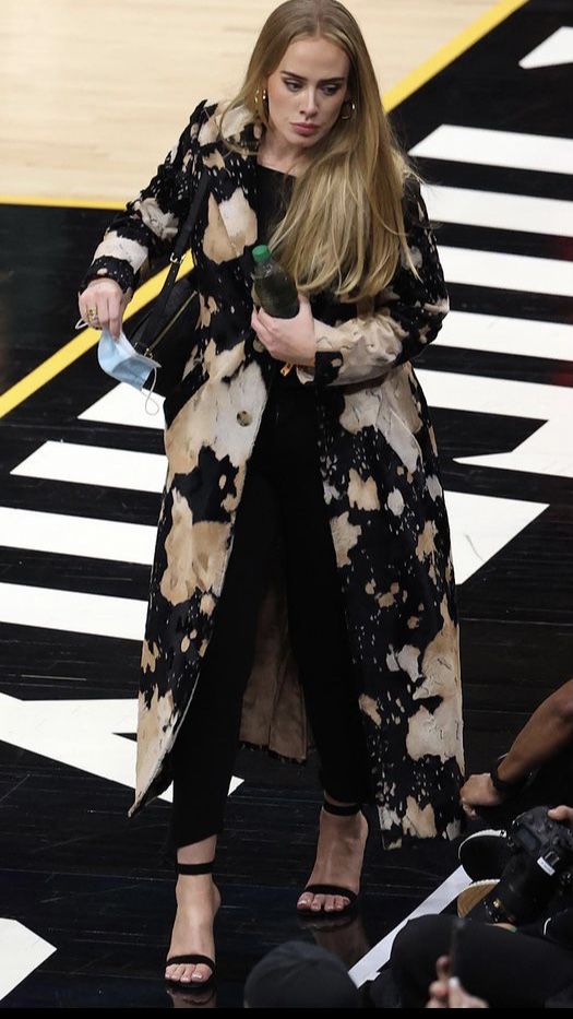 Adele sorprendió por su rejuvenecido rostro mientras vestía un conjunto muy glamoroso, tipo de ropa con la que no acostumbra a vestir. La cantante optó por un abrigo con estampado de animales, que combinó con un top negro y mallas, así como un par de tacones a juego. Además, complementó su atuendo con una variedad de joyas de oro y una mascarilla negra.