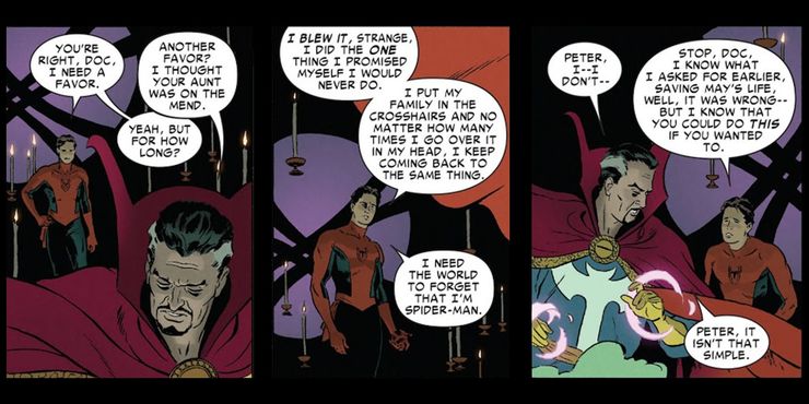 El primer tráiler de Spider-Man: No Way Home reveló que Peter Parker recuperará su identidad secreta utilizando el mismo apaño que utilizó en los cómics: el Doctor Extraño. Esta revelación sorprendió a muchos fans, a pesar de que la última película de Spider-Man, Lejos de casa, terminaba con Mysterio exponiendo póstumamente la identidad secreta de Spider-Man al mundo, y la promesa de que esto sería una parte importante del argumento de la secuela.