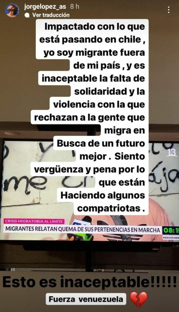 “Yo soy migrante afuera de mi país, y es inaceptable la falta de solidaridad y la violencia con la que rechazan a la gente que busca de un futuro mejor. Siento vergüenza y pena por lo que están haciendo algunos compatriotas”, finalizó al referirse al incidente en Iquique.