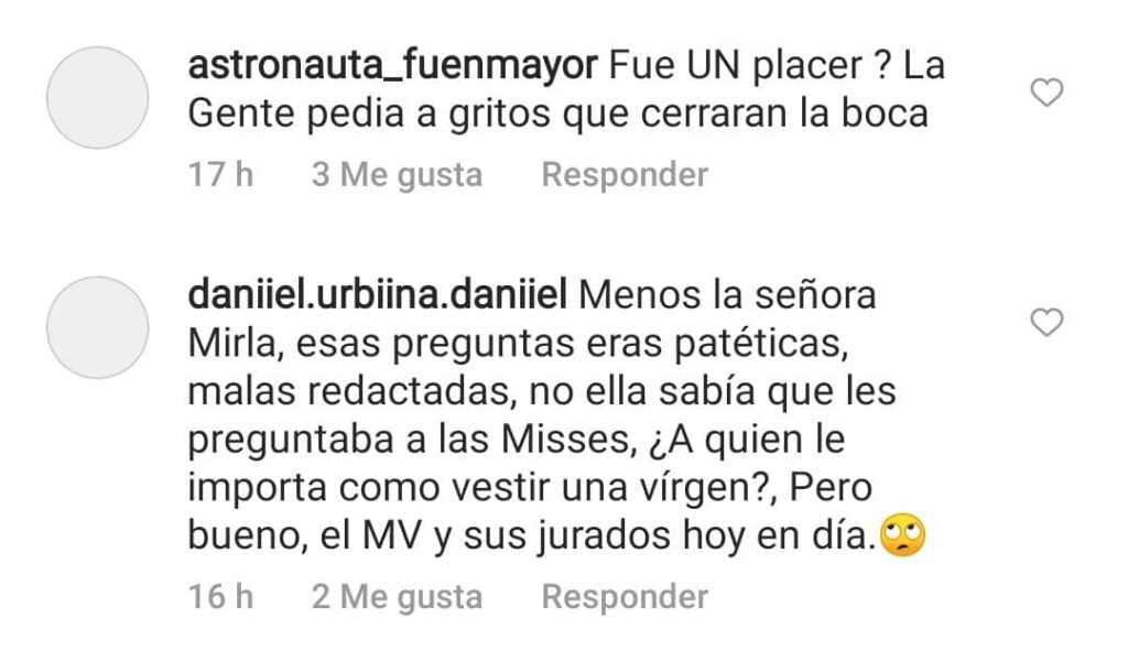 En la publicación que realizó la Organización a través de su cuenta oficial en Instagram, varios seguidores del concurso mostraron su rechazo hacia el trabajo de Mirla como jurado.