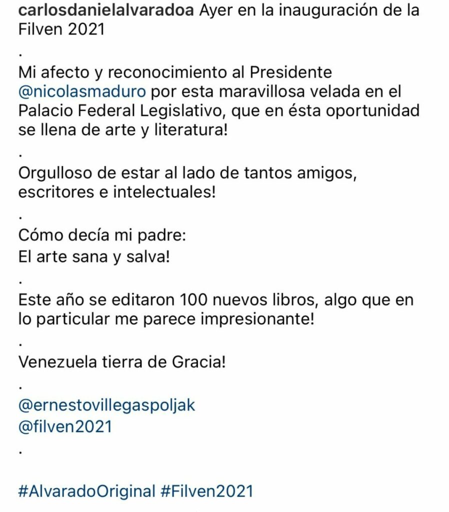 Para confirmar esta «teoría», ha sido el mismísimo actor quién ha publicado en redes sociales su fanatismo rojo; se trata de una fotografía de Alvarado junto a Nicolás Maduro. La instantánea fue tomada en las instalaciones de la Asamblea Nacional donde se celebró la Feria del Libro 2021 (Filven).