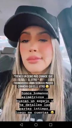Montalvo no se quedó callada ante la situación y se volcó en contra de sus detractores «‘Tienes un seno más grande que el otro’», «Somos seres humanos asimétricos, busca un espejo y te detallas las partes intimas. Luego me cuentas», escribió la modelo junto a una fotografía que compartió a través de su cuenta de Instagram.