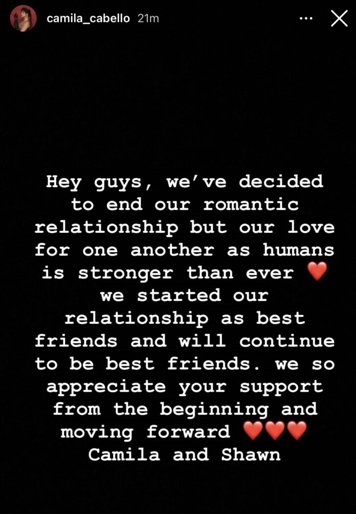 Y agregó, “Comenzamos esta relación como mejores amigos y seguiremos siéndolo. Apreciamos de corazón su apoyo desde el principio y ahora que comenzamos nuestros caminos por separado”. La artista finalizó añadiendo tres corazones rojos y firmando con “Camila y Shawn”.