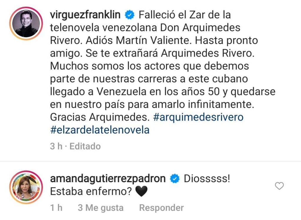 “Falleció el Zar de la telenovela venezolana Don Arquímedes Rivero. Adiós Martín Valiente. Hasta pronto amigo. Se te extrañará Arquímedes Rivero. Muchos somos los actores que debemos parte de nuestras carreras a este cubano llegado a Venezuela en los años 50 y quedarse en nuestro país para amarlo infinitamente. Gracias Arquímedes”, comentó Virgüez.