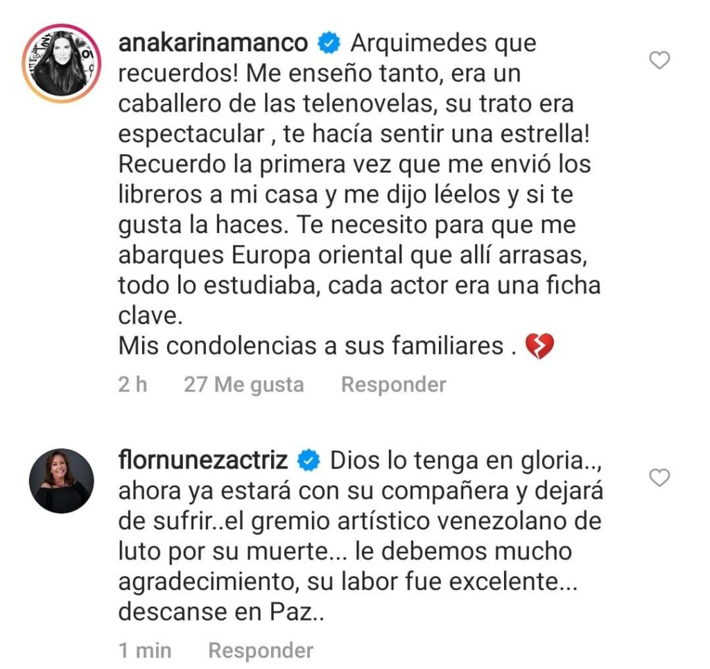 “¡Arquimedes que recuerdos! Me enseño tanto, era un caballero de las telenovelas, su trato era espectacular, te hacía sentir una estrella! Recuerdo la primera vez que me envió los libreros a mi casa y me dijo léelos y si te gusta la haces. Te necesito para que me abarques Europa oriental que allí arrasas, todo lo estudiaba, cada actor era una ficha clave. Mis condolencias a sus familiares. ?”, escribió Manco.
