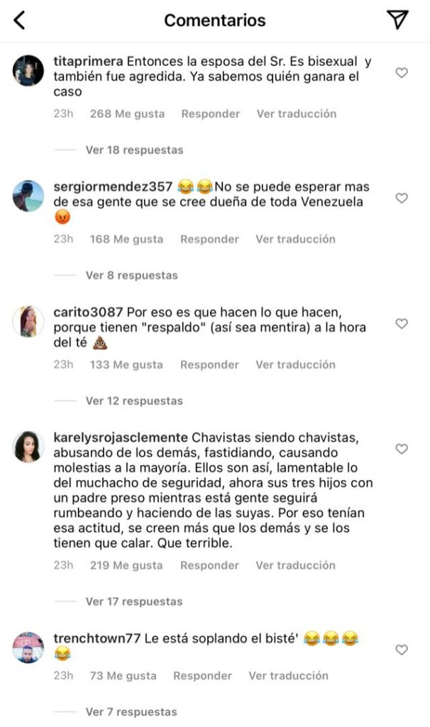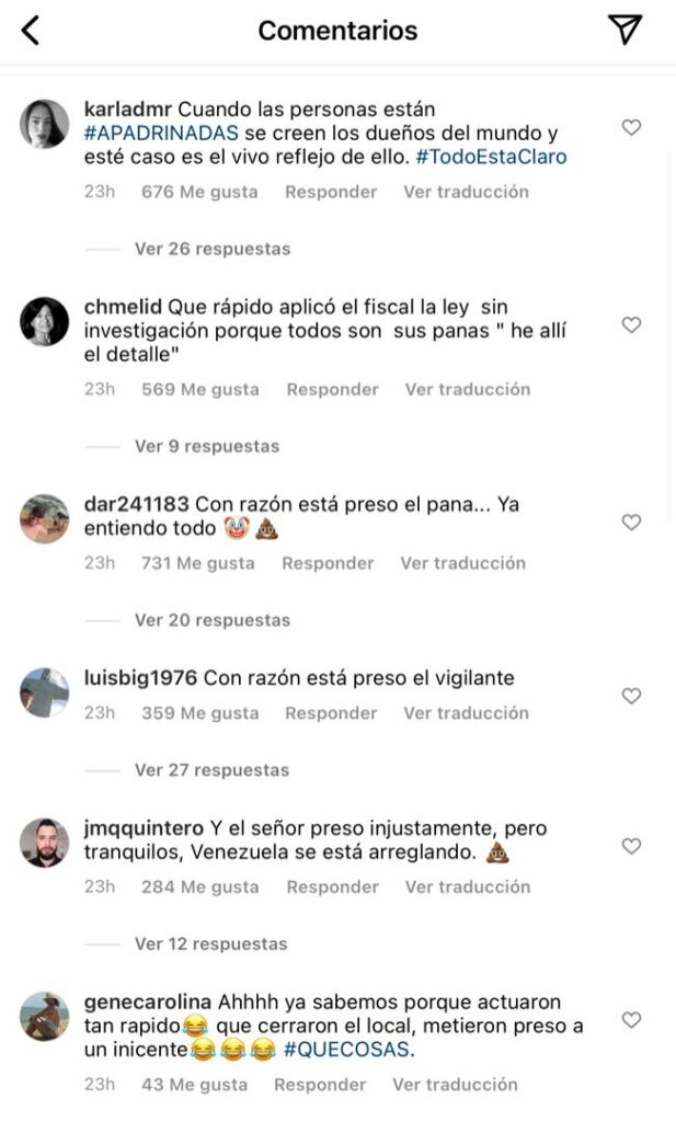 «Cuando las personas están #APADRINADAS se creen los dueños del mundo y esté caso es el vivo reflejo de ello»; «Con razón está preso el pana… Ya entiendo todo»; «Con razón está preso el vigilante»; «Que injusticia con el vigilante»; «Ahora menos para que dejen libre al Señor de seguridad», son algunos de los comentarios que han tomado fuerza en redes.