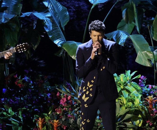 El cantante apareció sobre el escenario del tradicional Teatro Dolby de Hollywood luciendo un traje negro con bordados de mariposa e interpretó con mucho sentimiento y ternura la canción ‘Dos oruguitas’ de la película ‘Encanto’.
