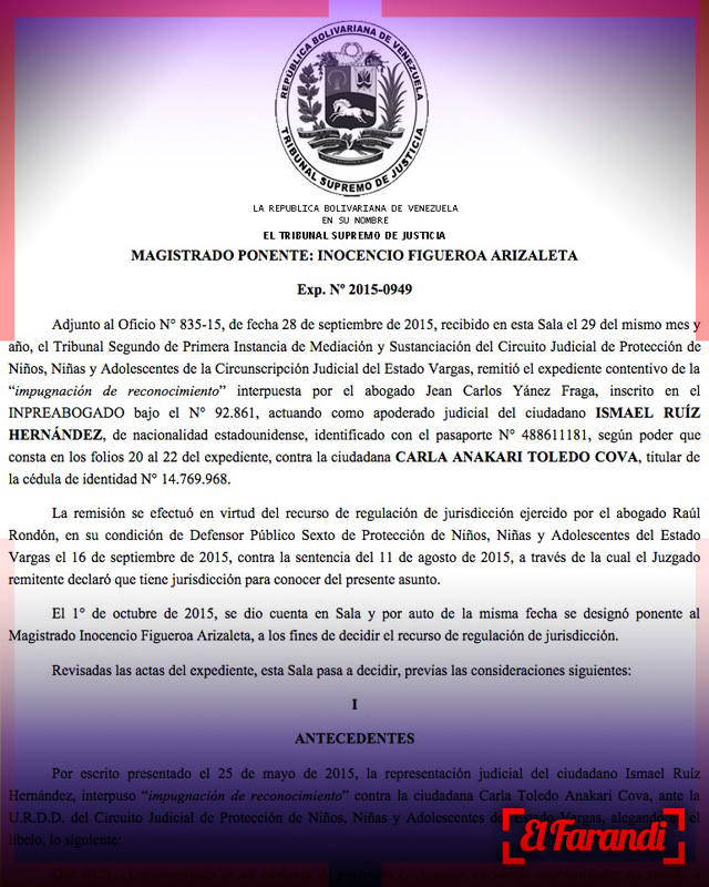 El documento fue emitido el día 17/11/2015 por la Sala Político Administrativa del Tribunal Supremo de Justicia donde da razón al apoderado del cantante de salsa, argumentando que el PODER JUDICIAL TIENE JURISDICCIÓN para conocer y decidir la “impugnación de reconocimiento”.