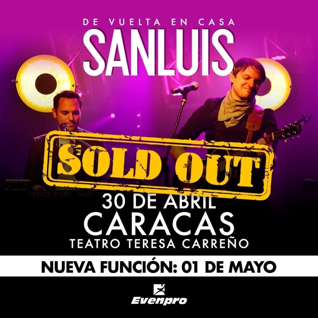 SanLuis celebra el Sold Out de su primer concierto en Caracas. Santiago y Luigi agotan la taquilla de su primera función en la Sala Ríos Reyna del Teatro Teresa Carreño y anuncian una segunda al día siguiente.
