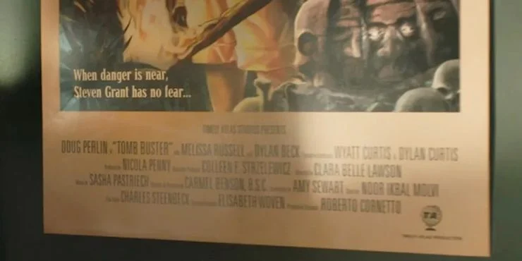 Cuando Steven contempla el póster de Tomb Buster que explica su origen secreto, el primer nombre entre los créditos es «Doug Perlin«. Se trata de un saludo a Doug Moench y Don Perlin, el dúo responsable de la creación del Caballero Luna en 1975. Otros easter egg del Caballero Luna incluyen a Melissa Russell (esposa del director de la serie, Jeremy Slater), Dylan Beck (miembro del equipo del Caballero Luna), y Wyatt y Dylan Curtis (parientes del productor ejecutivo del Caballero Luna, Grant Curtis, quizás).