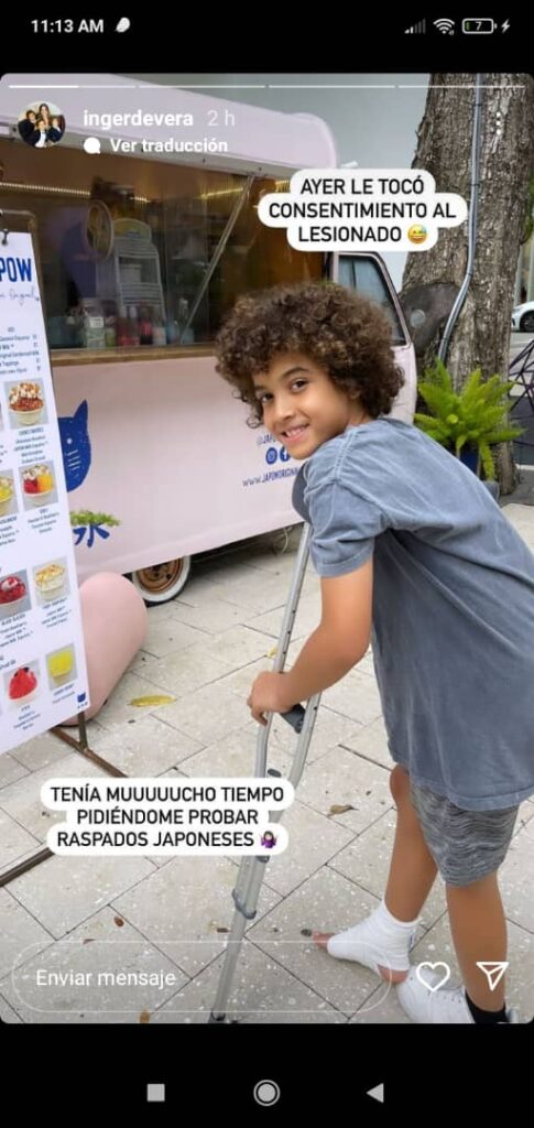 En este sentido, Inger confirmó «el flaco se lesionó el pie jugando fútbol el jueves pasado. Nada grave, pero le duele bastante y aún sigue inflamado. Le toca reposo y muletas por un tiempo». Además, la bailarina publicó un video consintiendo a su hijo con helado tipo raspados.