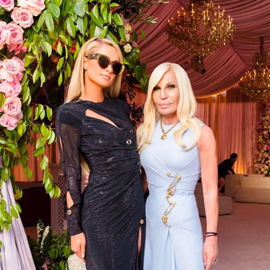 La novia lució un elegante vestido Versace de hombros caídos con una abertura en un lado que revelaba las piernas y un velo blanco clásico con bordes de satén, la dueña de la firma, Donatella, asistió al evento. Sam vistió también de Versace.