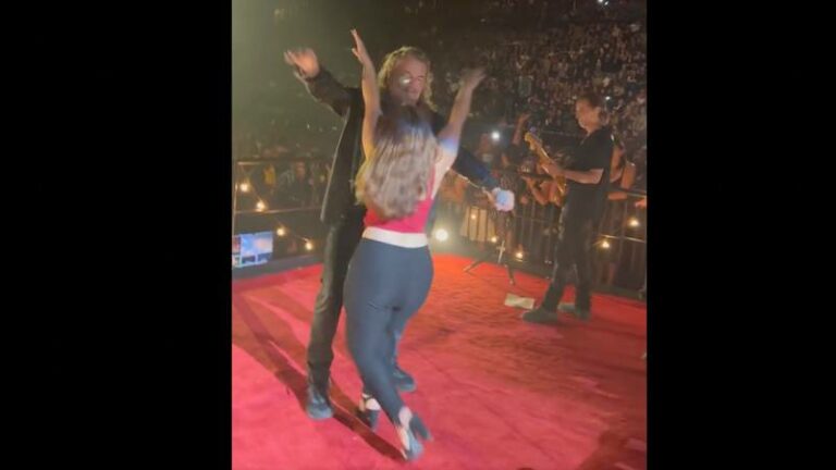 La banda invitó a una fanática a subir al escenario para compartir un momento con ellos. Sin embargo, la participación de la mujer terminó con un pequeño accidente.