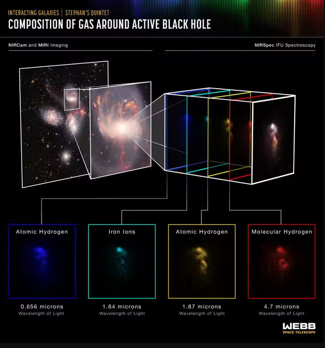 Webb apuntó recientemente su espectrómetro de infrarrojo cercano, o instrumento NIRSpec, hacia el agujero negro supermasivo que se encuentra en el corazón de la galaxia superior que se ve en la imagen de Webb del Quinteto de Stephan, una de las primeras cinco imágenes de Webb a todo color publicadas por la NASA y agencias colaboradoras el 12 de julio. La imagen muestra cinco galaxias aparentemente muy próximas, aunque la quinta en realidad está mucho más cerca de la Tierra.