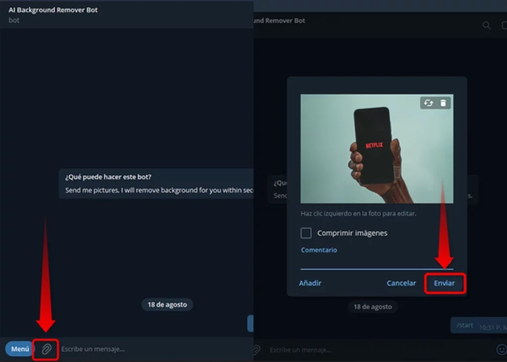 La función de este bot es eliminar el fondo de una imagen que tengas. Si quieres utilizarlo, solo debes seguir estos sencillos pasos.
