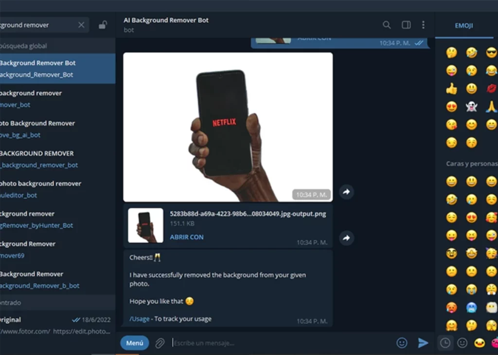 Solo será cuestión de segundos para que el bot te envíe una imagen sin fondo y en formato .PNG, ya solo tendrás que ubicar la imagen descargada en la carpeta de descargas de Telegram y listo.
