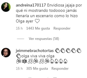 “Envidiosa jajaja porque ni mostrando todoooo, jamás llenaría un escenario como lo hizo Olga ayer”; “El que es feliz no jode”; “La envidia te mata???”; “Diosa canales tiene rato que no es nombrada, algo tiene que hacer ?”; “Diosa canales ya no haya con quien meterse para figurar ? Olga te amamos”; “Que enseñe todo diosa como está acostumbrada para que le paren”; “La mujer de fuego no se rebaja con vedettes ?”, son algunos de los comentarios en contra de la venezolana, quien desde hace años reside en Colombia.