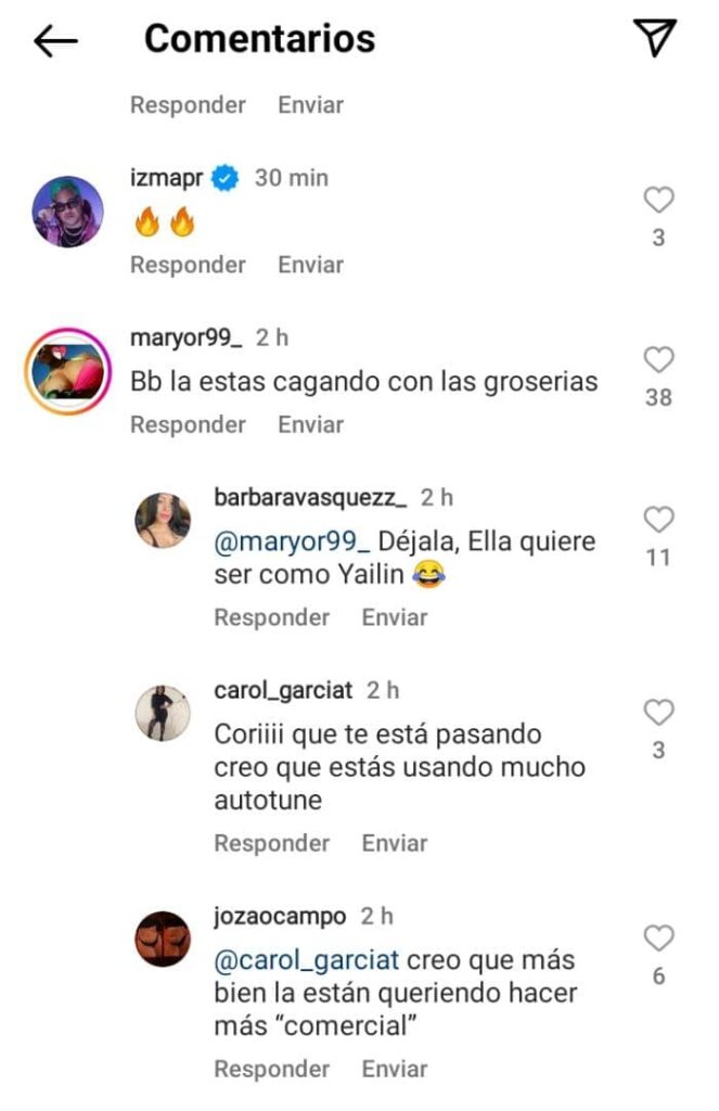 “Bb la estas cagando con las groserías, Déjala ella quiere ser como Yailin”, “Coriii que te está pasando creo que estas usando mucho autotune”, «Esta niña en todos los videos hace lo mismo no tiene movimiento, debería hacer coreografías a ver si hay un cambio”, “Sale aguevoniad@ siempre da flojera verla cantar!”, “Te fajaste con la letra”, “Creo que más bien la están queriendo hacer más “comercial”, “Uy muy capaz se lleva todos los premios de la Pepsi music otra vez ??”, “Manaaaa la tetitaaaa?”, son parte de las reacciones.