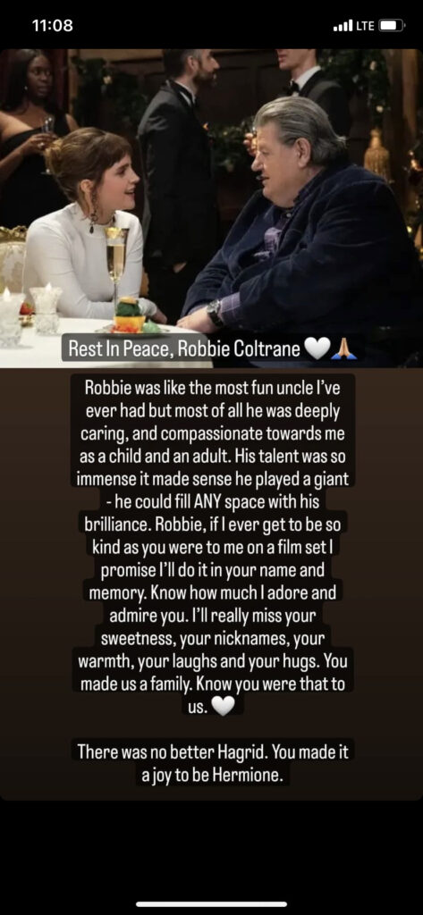 «Robbie, si alguna vez llego a ser tan amable como fuiste conmigo en un set de filmación, prometo que lo haré en tu nombre y memoria. Sabes cuánto te adoro y te admiro. Realmente extrañaré tu dulzura, tus apodos, tu calor, tus risas y tus abrazos. Tú nos hiciste una familia. Sé que eras eso para nosotros. No había mejor Hagrid. Hiciste que fuera un placer ser Hermione» concluyó.