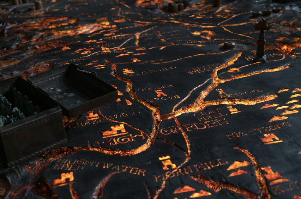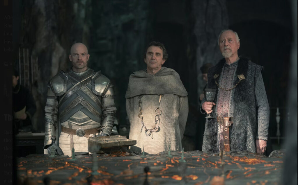 Basándonos en estas imágenes del episodio 10 de la Casa del Dragón, parece que el final de la primera temporada será la inversa del penúltimo episodio. El episodio 9, «El Consejo Verde», se centró por completo en los verdes de Desembarco del Rey, mientras que el episodio 10 se centrará en el consejo negro no oficial de Rocadragón, que incluye a Ser Lorent Marbrand (Max Wrottesley) y al maestre Gerardys (Phil Daniels), fotografiados uno al lado del otro en una imagen superior. Varias imágenes también destacan la Mesa Pintada, que los negros utilizarán para reunirse mientras planean su próximo movimiento, probablemente un asedio a la Fortaleza Roja.
