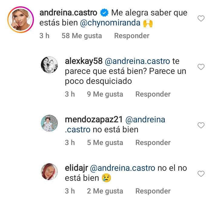 A raíz de esto, Andreina Castro comentó “Me alegra saber que estás bien @chynomiranda”.