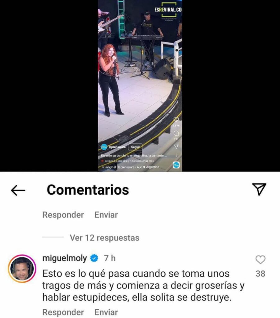 El también cantante Miguel Moly se convirtió en uno de esos críticos que no dudó en expresar sus palabras ante el bochornoso momento: «Esto es lo que pasa cuando se toma unos tragos de más y comienza a decir groserías y hablar estupideces, ella solita se destruye», escribió.