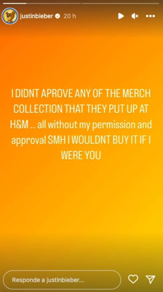 «NO HE APROBADO NINGUNA DE LAS COLECCIONES DE MERCH QUE HAN PUESTO A LA VENTA EN H&M. Todo sin mi autorización y aprobación. EN SU LUGAR, YO NO LO COMPRARÍA», escribió el intérprete de ‘Baby’.