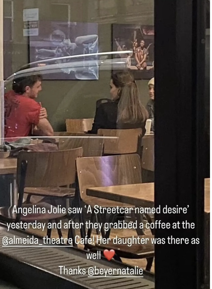Según el sitio de noticias Page Six, la mujer fue captada mientras tomaba un café en compañía del galán de 26 años, luego de que la expareja de Brad Pitt fue a verlo en la obra A Streetcar Named Desire, en el teatro Almeida de Londres.