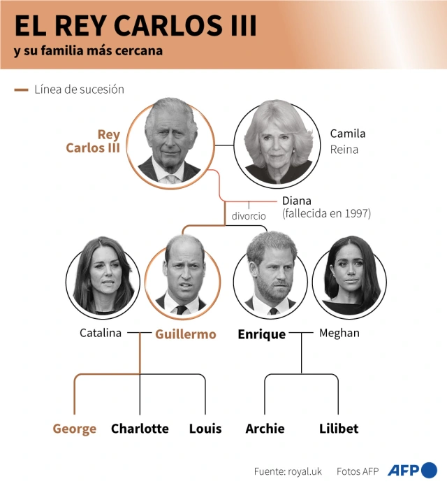 Según marca la línea de sucesión al trono de Inglaterra, Guillermo, el hijo mayor del actual rey Carlos III y de su primera esposa, Diana, princesa de Gales, sería el próximo rey de Reino Unido. Guillermo, está casado con Catalina desde 2011 que hereda el título de princesa de Gales, con la que tiene tres hijos: los príncipes Jorge, Carlota y Luis de Gales.