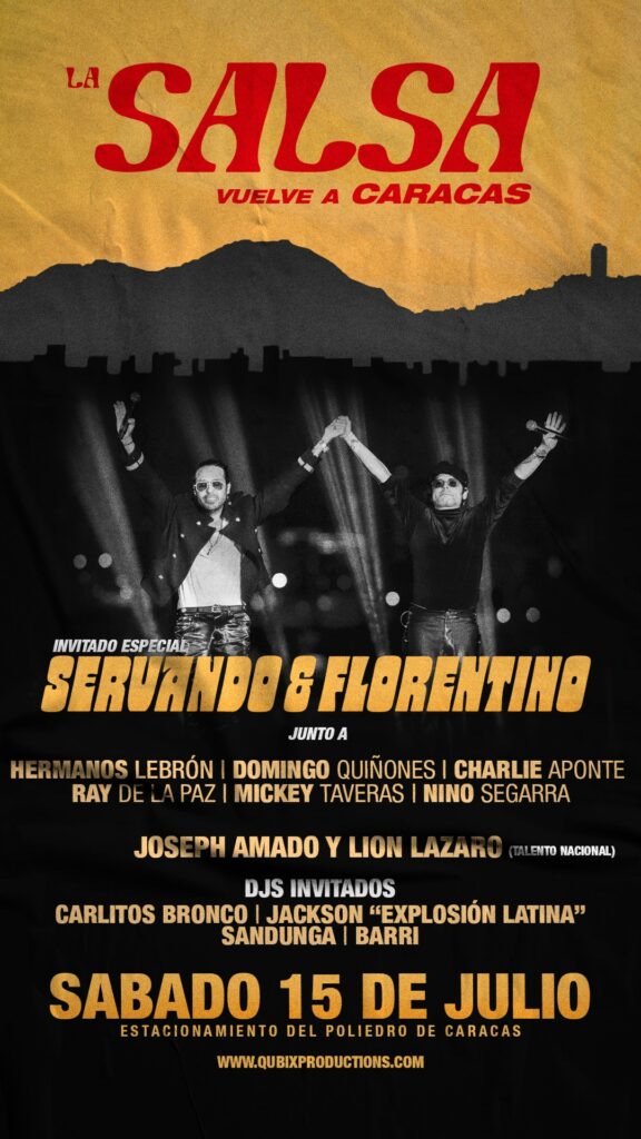 En “La salsa vuelve a Caracas”, evento que se estará llevando a cabo el venidero sábado 15 de julio en el Estacionamiento del Poliedro de Caracas, Servando y Florentino compartirán tarima con: Los Hermanos Lebrón, Domingo Quiñones, Charlie Aponte, Ray De La Paz, Mickey Taveras y Nino Segarra, mientras que por Venezuela también estarán Lion Lázaro y Amado La Voz. Dj Sandunga Oficial, Jackson “Explosión Latina” y Carlitos Bronco amenizarán este gran encuentro que dará inicio a las 4 de la tarde.