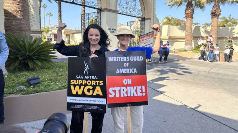 (En la foto: Fran Drescher, presidenta de SAG-AFTRA, y Meredith Stiehm, presidenta de WGA)