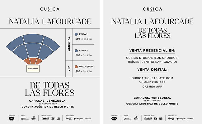 Natalia Lafourcade en Caracas es una producción de Cúsica, de la mano con Cerveza Zulia y Digitel, en alianza con El Nacional, UB Magazine y Onda La Superestación.